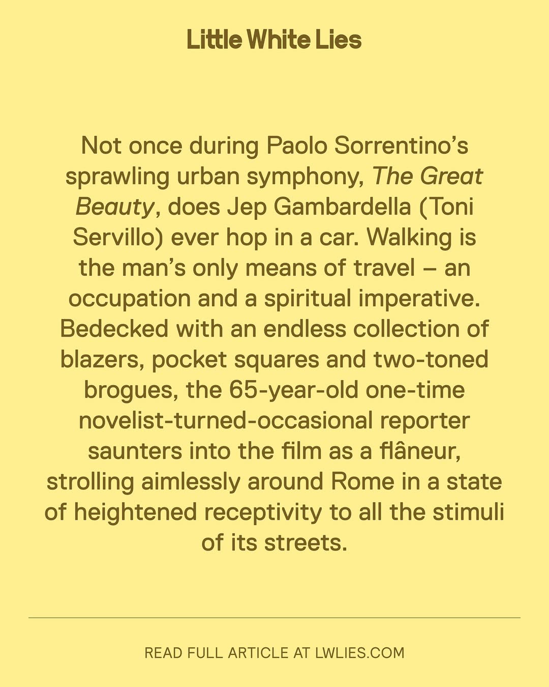 “La grande bellezza” di Paolo Sorrentino x La Dolce Vita @lwlies screening events on the 4th and 5th of July at @regentstcinema - London. A Celebration of Italian Screen Style, in partnership with Disaronno